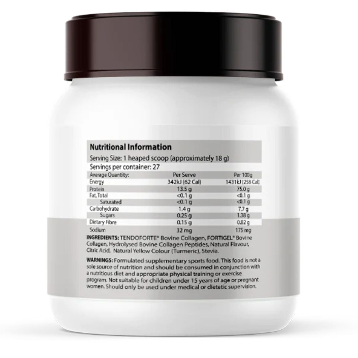 TENDOFORTE® Bovine Collagen, FORTIGEL® Bovine Collagen, Hydrolysed Bovine Collagen Peptides, Natural Flavour, Citric Acid, Natural Yellow Colour (Turmeric), Stevia.