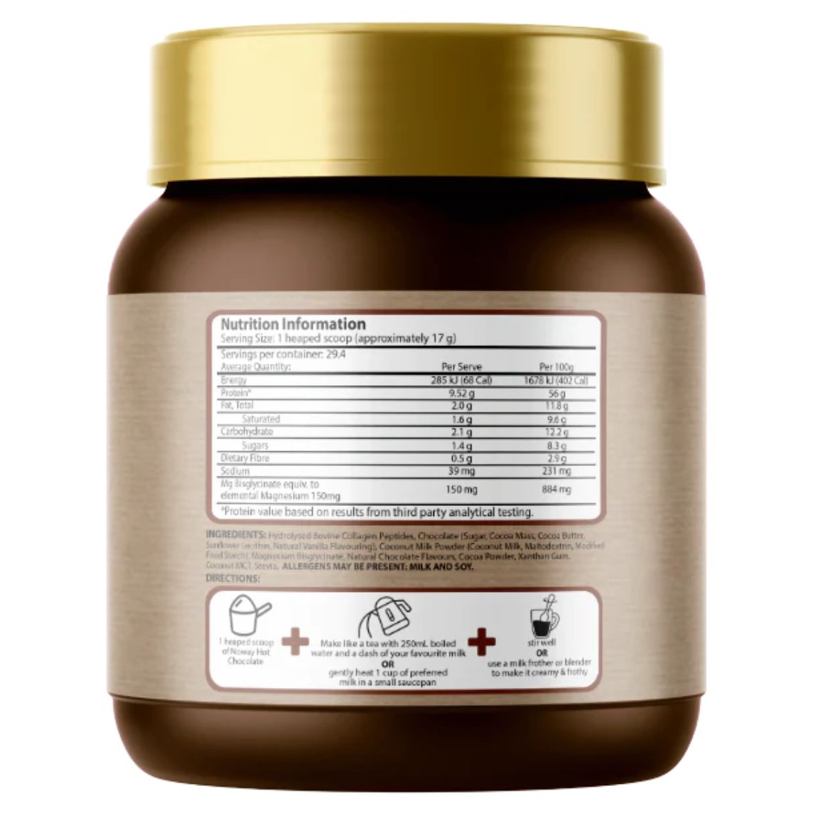 Ingredients: Hydrolysed collagen, Chocolate (Sugar, Cocoa mass, Cocoa butter, Sunflower lecithin, Natural vanilla flavouring), Coconut Milk Powder, Natural Chocolate Flavour, Magnesium Bisglycinate, Cocoa powder, Xantham Gum, Coconut MCT, Stevia Made with natural flavours, free of propylene glycol.