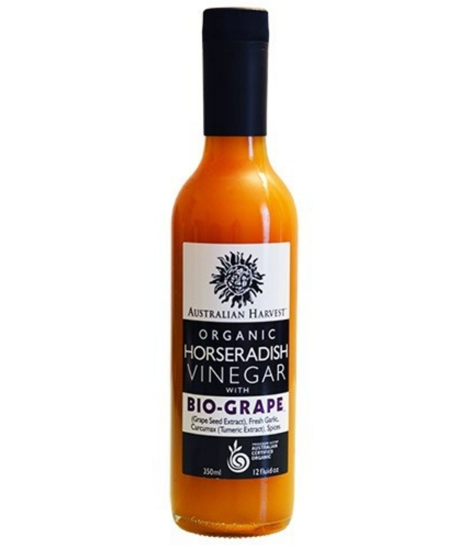 Certified Organic Raw Horseradish Apple Cider Vinegar (350ml, glass) with Garlic, Turmeric, Cayenne Pepper and Bio-Grape by Australian Harvest.