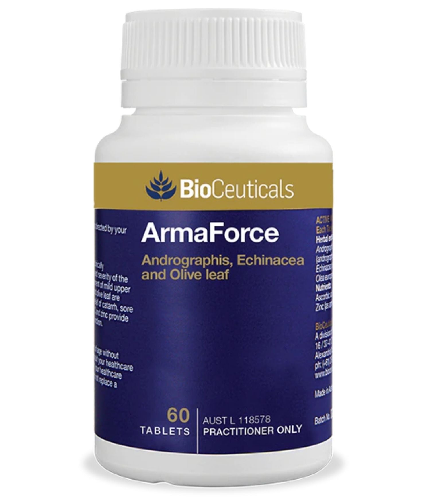ArmaForce is a comprehensive formula combining the herbal and nutritional ingredients andrographis, echinacea, olive leaf, vitamin C and zinc. It is scientifically formulated to provide relief of symptoms of mild upper respiratory tract infections and decrease the severity and duration of colds. ArmaForce supplies nutritional support for healthy immune function.