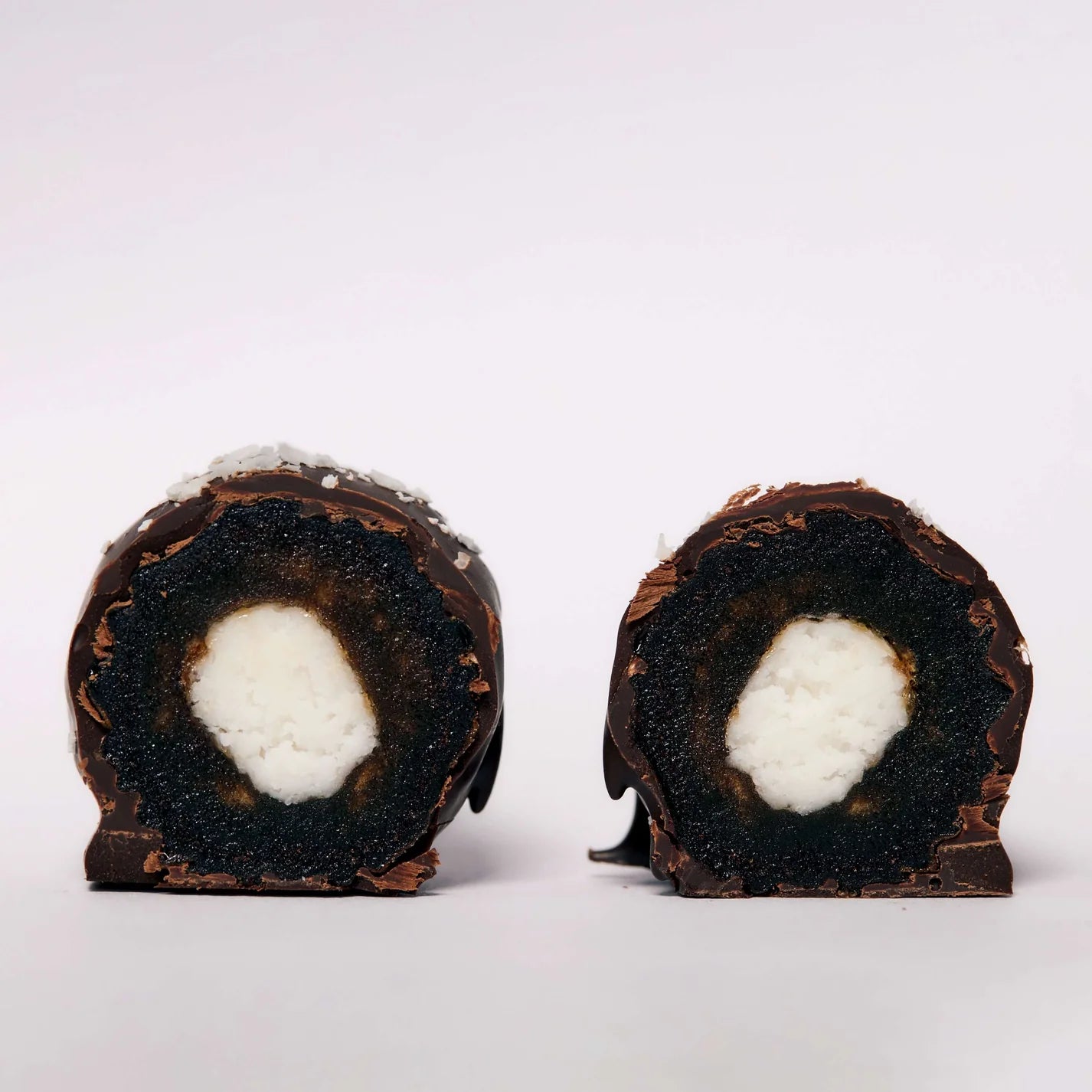 Two individually wrapped Medjool dates filled with chewy coconut butter, covered in our date sweetened dark chocolate.