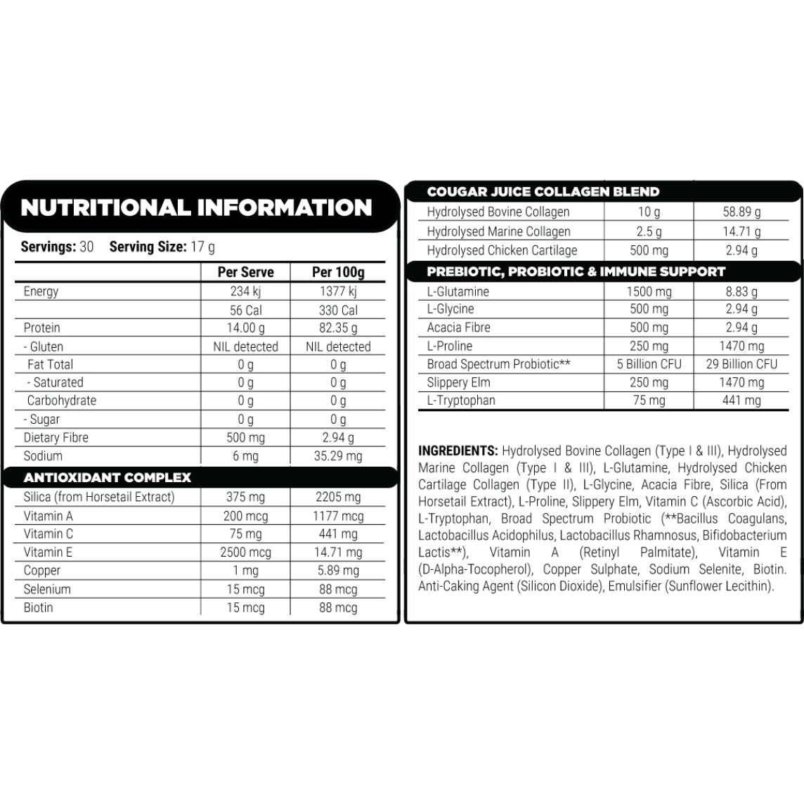 In addition to the presence of Types I, II and III Collagen, Faction Labs Cougar Juice contains a blend of Antioxidants, an Immune Support Matrix and a Nails and hair complex (Biotin, Selenium and Copper).