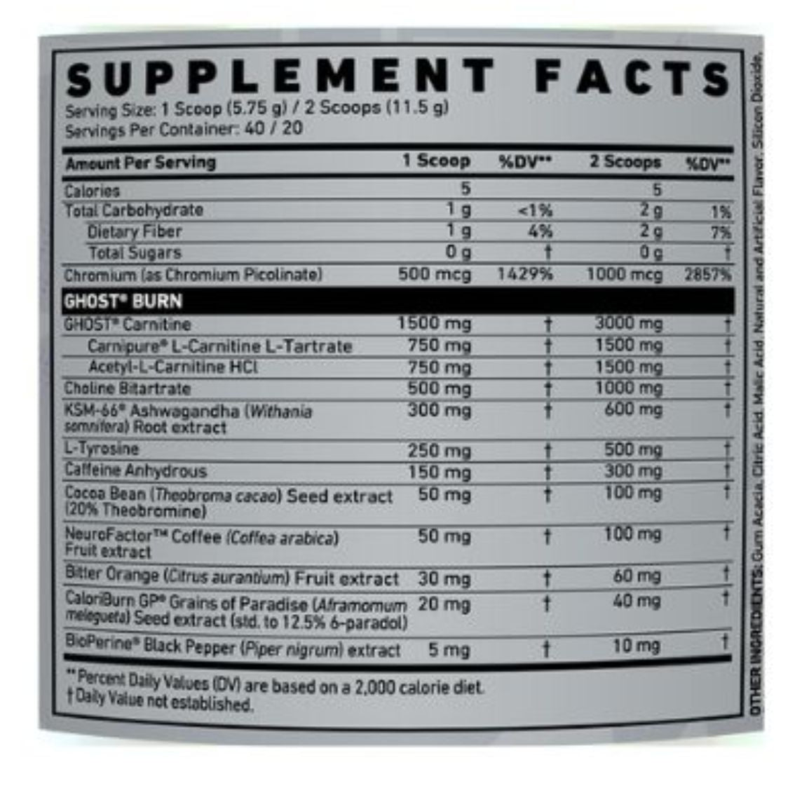 The other ingredients in Ghost Burn are Polydextrose, Citric Acid, Malic Acid, Natural and artificial flavour, Tartaric Acid, Silicon Dioxide, Calcium Silicate, Sucralose, Turmeric Powder, Acesulfame Potassium and Beet Root Powder.