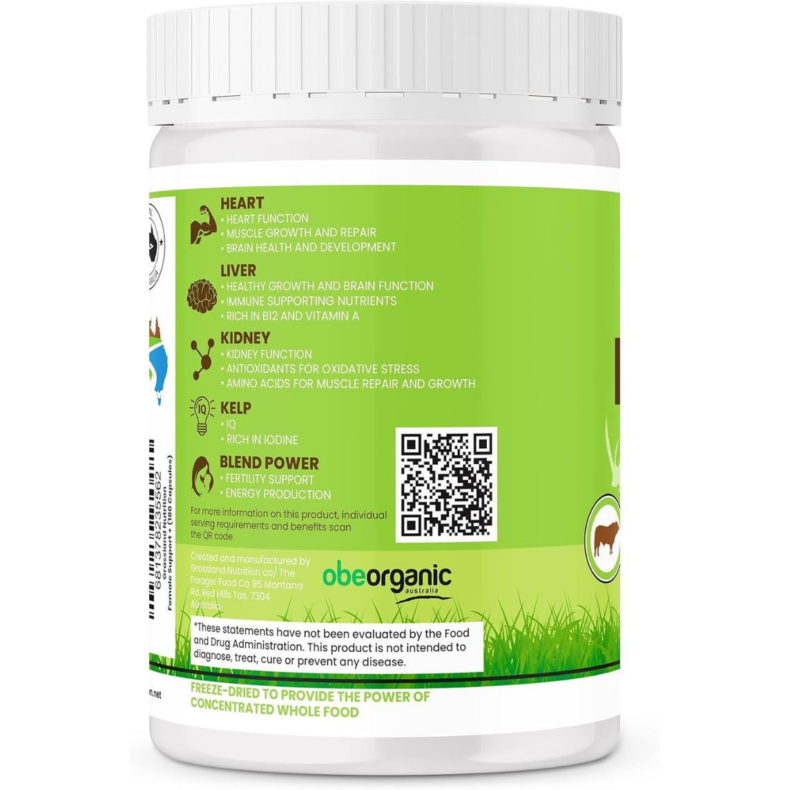 We take pride in sourcing our grass-fed beef organs from OBE ORGANIC in the Australian Channel Country. Here, cattle graze freely on a nutrient-dense diet consisting of over 250 native plant species, nourished by natural rainfall. Our product is 100% organic and halal sourced, containing no fillers, flow agents, or magnesium stearate. What sets our Female Support blend apart is its freeze-dried process, which optimally preserves heat-sensitive nutrients, co-factors, and biological activity. This ensures that you receive a nutrient-dense superfood naturally rich in vitamins B12 and CoQ10, promoting your overall well-being.