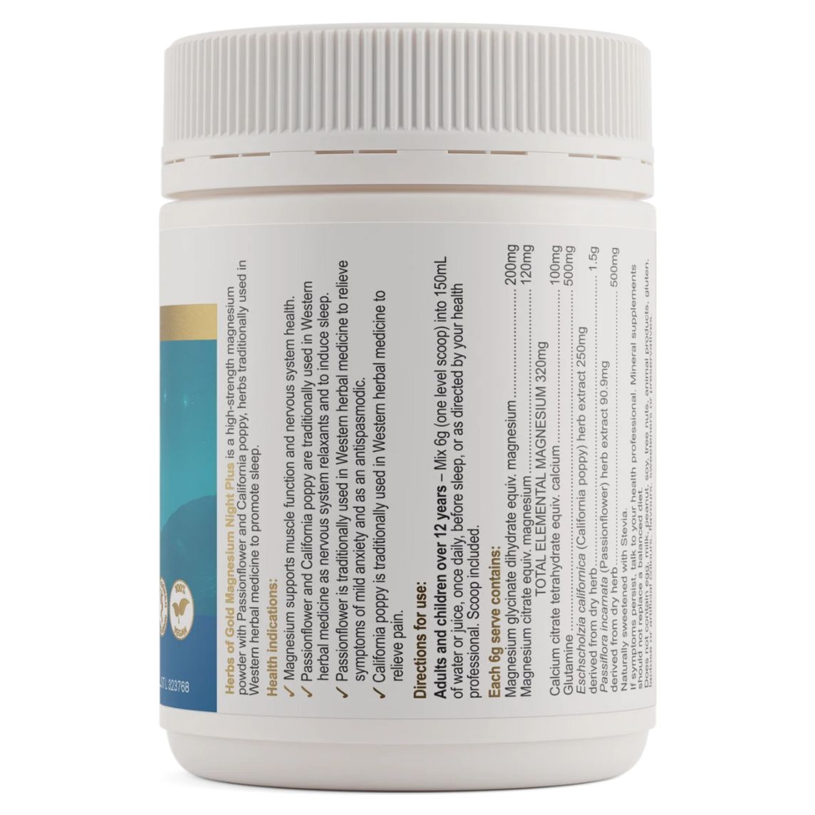 Herbs of Gold Magnesium Night Plus is a delicious citrus berry flavoured drink that contains high-strength magnesium plus Passionflower and California poppy, herbs traditionally used in Western herbal medicine to promote sleep.