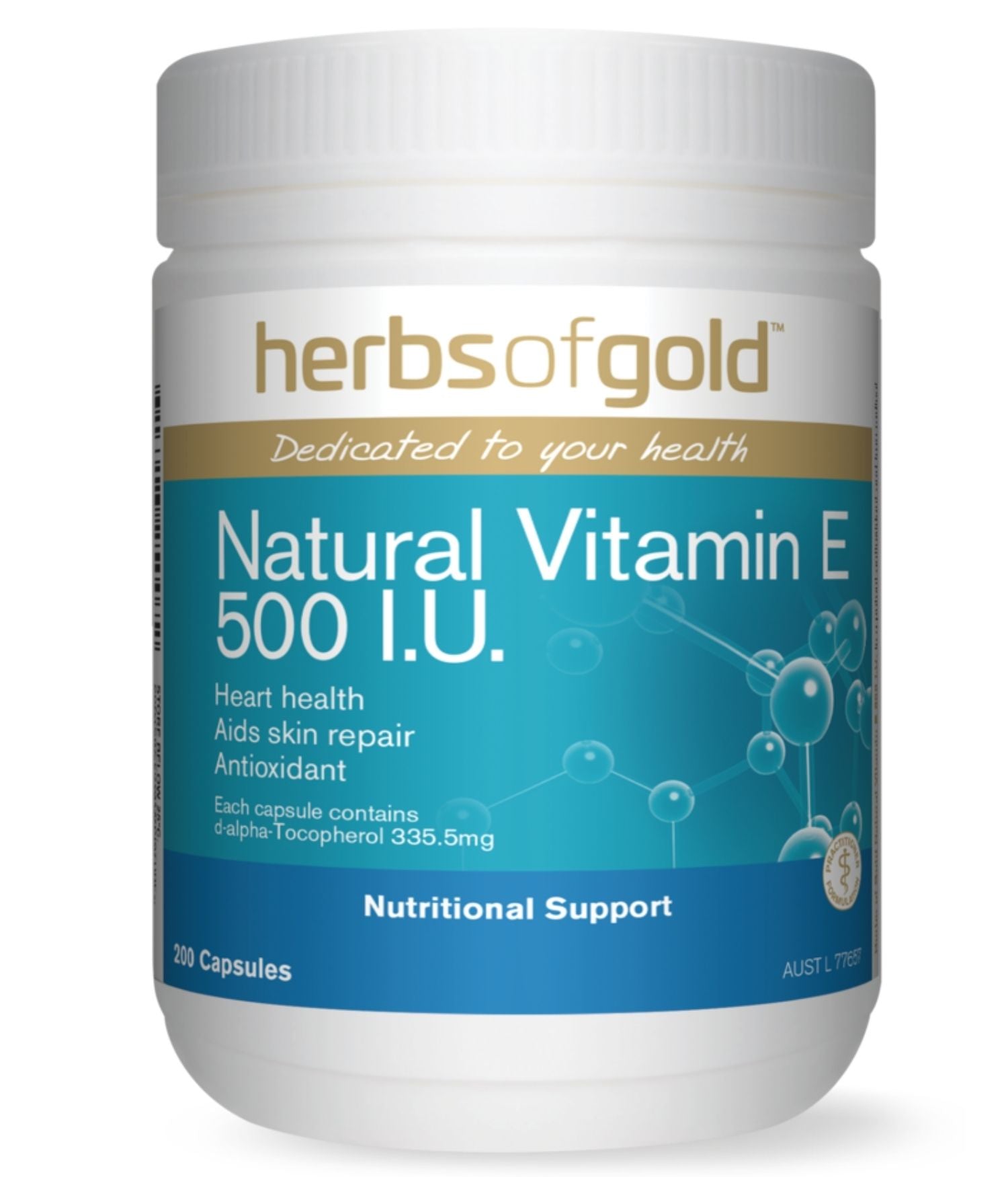 - Natural Vitamin E 500 I.U. is an anti-oxidant and free radical scavenger, used to encourage skin and tissue repair. Vitamin E supports healthy heart function and is important in the maintenance of normal cardiovascular health. Vitamin E may also assist blood circulation and may help in the maintenance of cell strength.