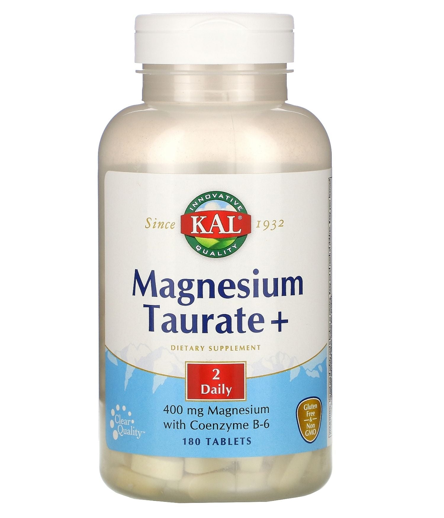 KAL Magnesium Taurate+ combines the mineral Magnesium with a free-amino acid, Taurine. Magnesium is intended to provide nutritive support for normal, healthy nerve and muscle function, and regulates the healthy flow of ions across cellular membranes to help provide membrane stability and protect against oxidative stress in the heart, blood vessels and tissues. Pyridoxal-5-Phosphate, the coenzyme form of Vitamin B-6, provides bioavailable nutritive support for red blood cell synthesis and nerve tissue function. Studies have suggested a synergistic relationship between Magnesium and Vitamin B-6.