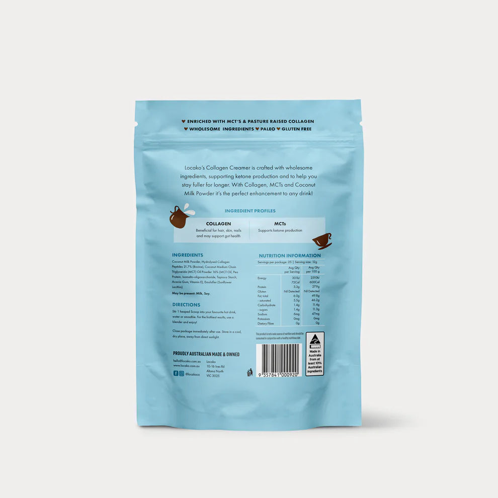 Our delicious Collagen Creamers are crafted with premium, wholesome ingredients designed to support ketone production and help you stay fuller for longer. Each serve is optimised with high-quality Collagen to promote healthy skin, hair, and gut function, making it a powerhouse addition to your daily routine. Perfect as a creamy boost in black coffee, your favourite hot drinks, water, or smoothies, this versatile blend delivers nourishment and satisfaction in every cup.