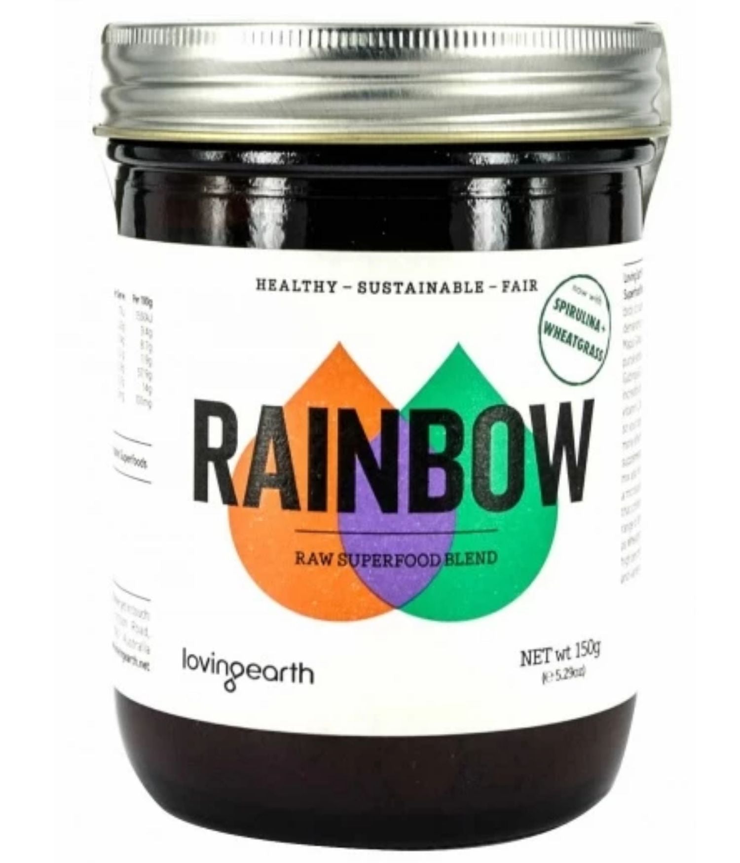 Loving Earth’s Rainbow Superfood Blend is a unique fusion of the world's most nutritious raw foods. Includes Maqui (30%), Camu Camu (20%), Acai (20%), Gubinge (20%), Spirulina (5%) and Wheatgrass (5%).