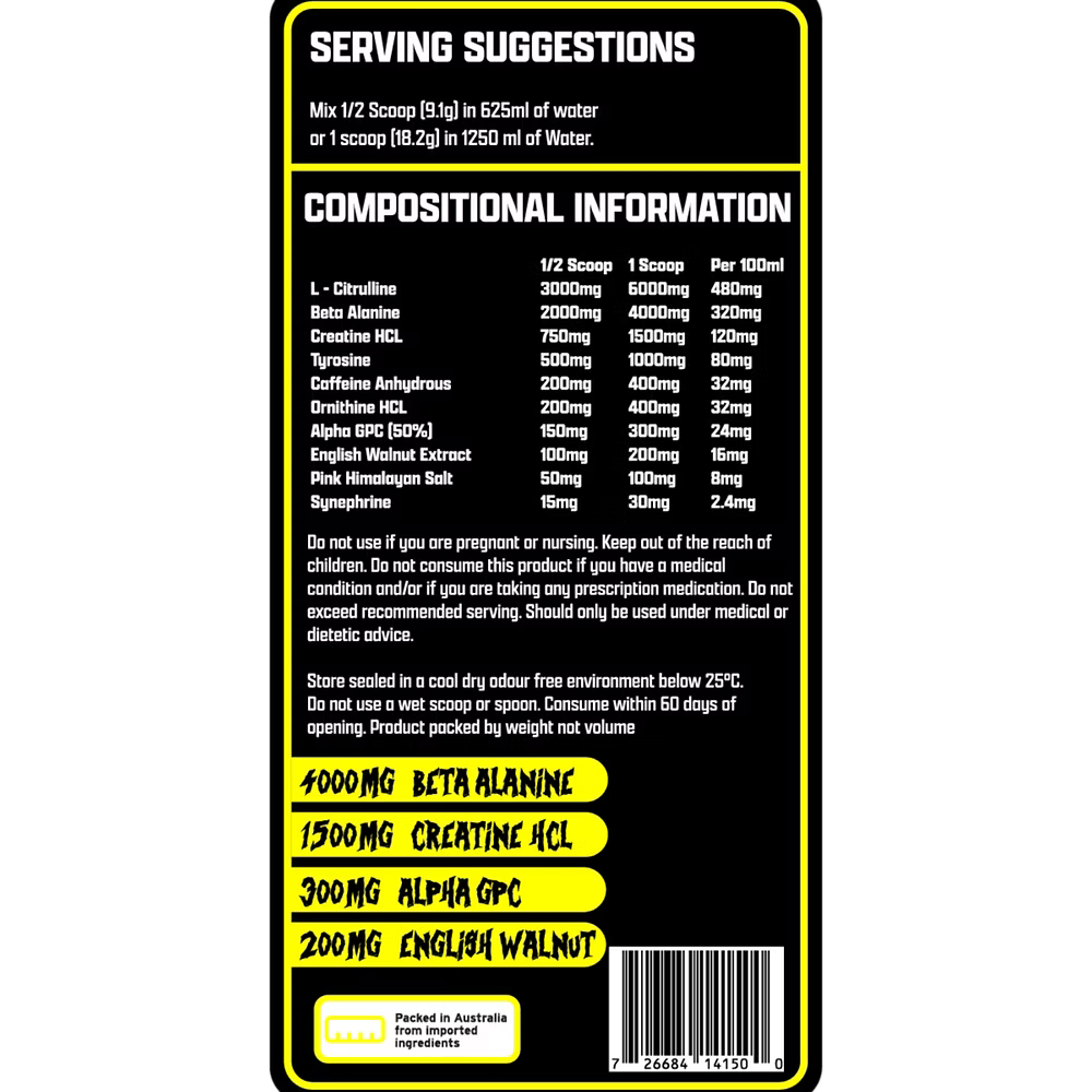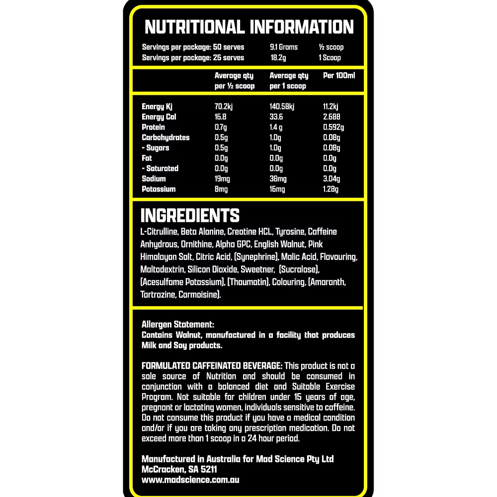 Mad Science Extreme Pre-Workout delivers a powerful blend of clinically dosed ingredients designed to maximise performance, focus, and endurance during every session. Formulated to push physical and mental limits, this high-intensity formula supports strength, pump, and energy output for those who demand more from their workouts.