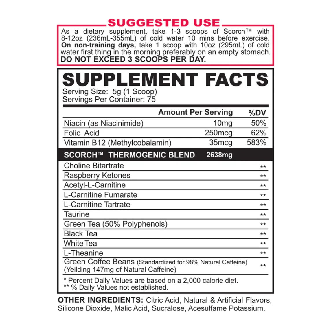 As a dietary supplement, take one to two scoops with cold water first thing in the morning on an empty stomach. On training days, take another one to two scoops with cold water as a pre-workout in the afternoon no later than 5pm. Avoid eating other foods or drinking a protein shake within 20 minutes after consuming Scorch™. FOR BEST RESULTS, USE FOR A MINIMUM OF EIGHT CONSECUTIVE WEEKS FOLLOWED BY A SUBSEQUENT 4 WEEK BREAK. DO NOT EXCEED MORE THAN 4 SCOOPS PER DAY.
