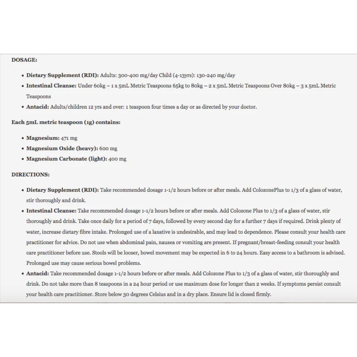 Magnesium: 471mg Magnesium Oxide (heavy): 600mg Magnesium Carbonate (light): 400mg |
