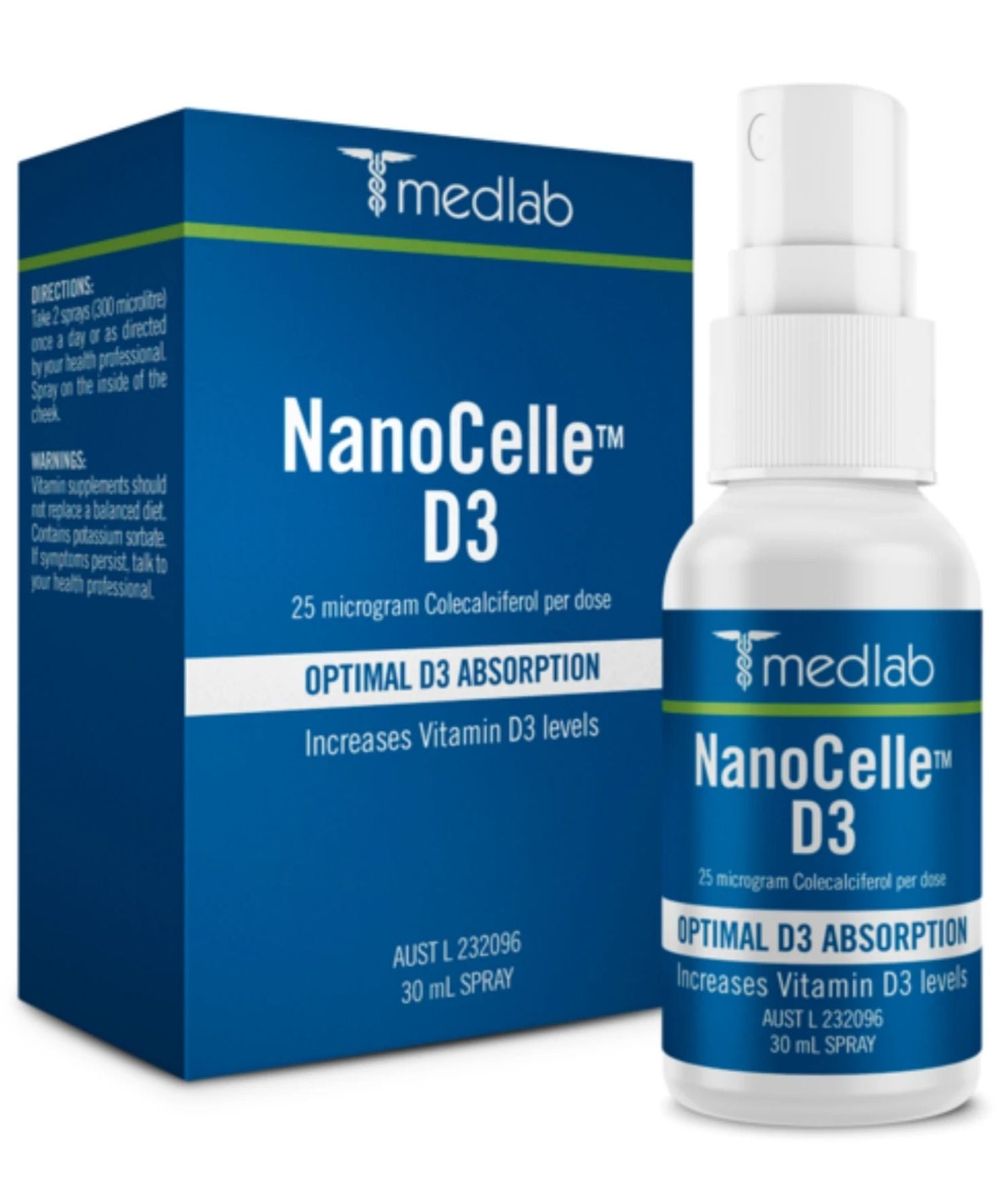 NanoCelle™ D3 is developed from patent-protected nano-technology creating Vitamin D3 nanoparticles that delivers nanoparticle-sized molecules of the vitamin for absorption across the oral buccal mucosa, bypassing the gastrointestinal tract. NanoCelle™ D3 is indicated to assist in the management of medically diagnosed vitamin D deficiency. Vitamin D3 aids in dietary calcium and phosphorus absorption, important for maintaining healthy bone mineral density. Vitamin D3 binds to the vitamin D receptor (VDR), which is located on all body cells. Activation of the VDR has been shown to regulate hundreds of genes. Because immune cells have the VDR, vitamin D may also assist with immune system function. Vitamin D3 is a fat-soluble vitamin that is naturally synthesised in the body from sun exposure (ultraviolet light) however the amount of vitamin D production depends on geographic location, season, time of day and weather conditions. In addition, clothing habits, lifestyle, and workplace (e.g., indoor versus outdoor), sunscreen use, and sun avoidance practices have an impact on vitamin D synthesis. Vitamin D3 production is also determined by a persons skin type, as the darker pigmented the skin is the less vitamin D3 is produced.