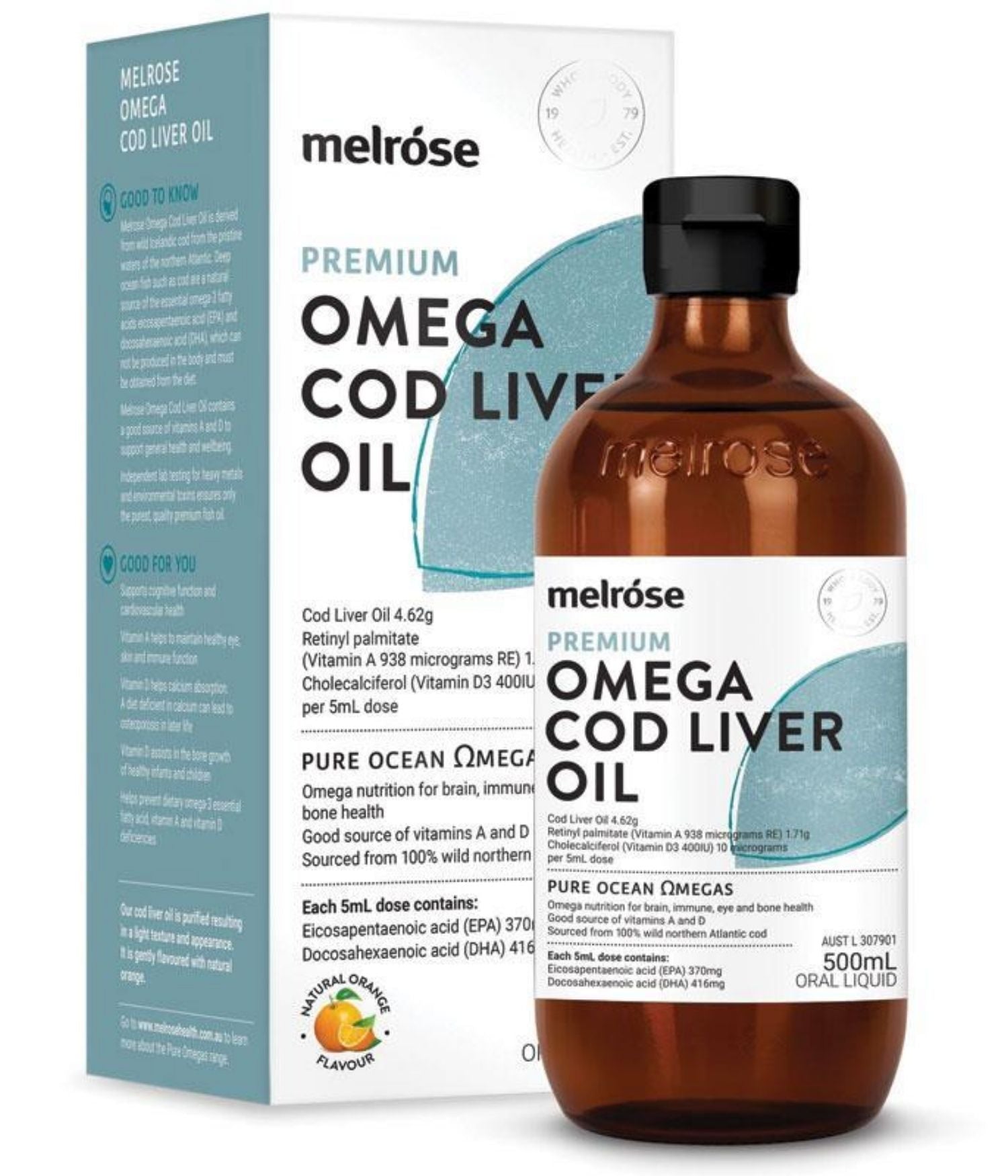 Melrose Cod Liver Oil is rich in Vitamin A and D, as well as being a good source of Omega 3 fatty acids. Vitamin A aids immunity and supports healthy vision whilst Vitamin D assists in calcium absorption, which is important for the development of healthy bones and teeth.