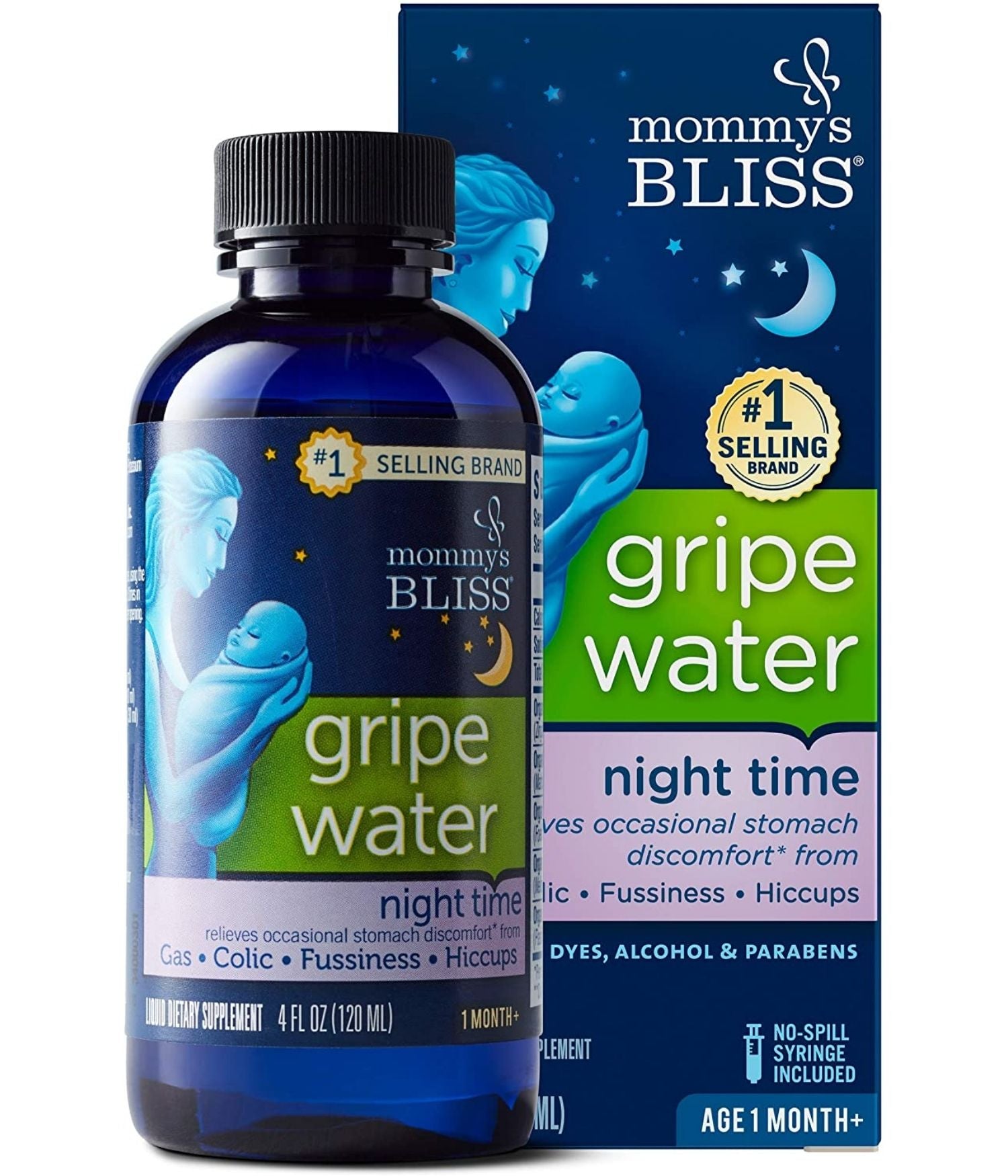 Mommy's Bliss Gripe Water Night Time is a safe and effective herbal supplement used to ease gas and stomach discomfort often associated with colic hiccups and teething while promoting a restful sleep.