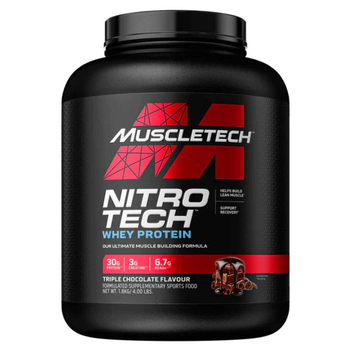 Build more strength with Nitro Tech by MuscleTech! This scientifically engineered whey isolate protein powder+ lean musclebuilding formula has been specifically designed for athletes and bodybuilders who are looking for maximum performance, more muscle, improved strength. The high-strength protein in this formula has been primarily sourced from whey protein isolate and is enhanced with the most studied form of creatine for maximum gains in muscle and strength. Researches have shown that subjects using the core formula in Nitro-Tech gained 8.8 lbs. of lean muscle in six weeks compared to subjects who used regular whey protein, who gained 5.1 lbs.