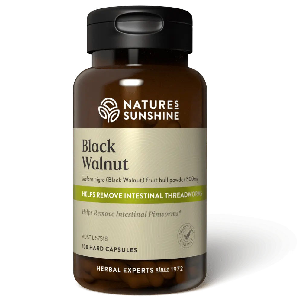 Traditionally used in Western herbal medicine to help remove intestinal pinworms and threadworms, Nature’s Sunshine Black Walnut is a trusted formula for gut health and regularity. Each capsule delivers a high-potency 500 mg dose of black walnut hull powder, known for its natural laxative properties that support healthy digestion and regular bowel movements.