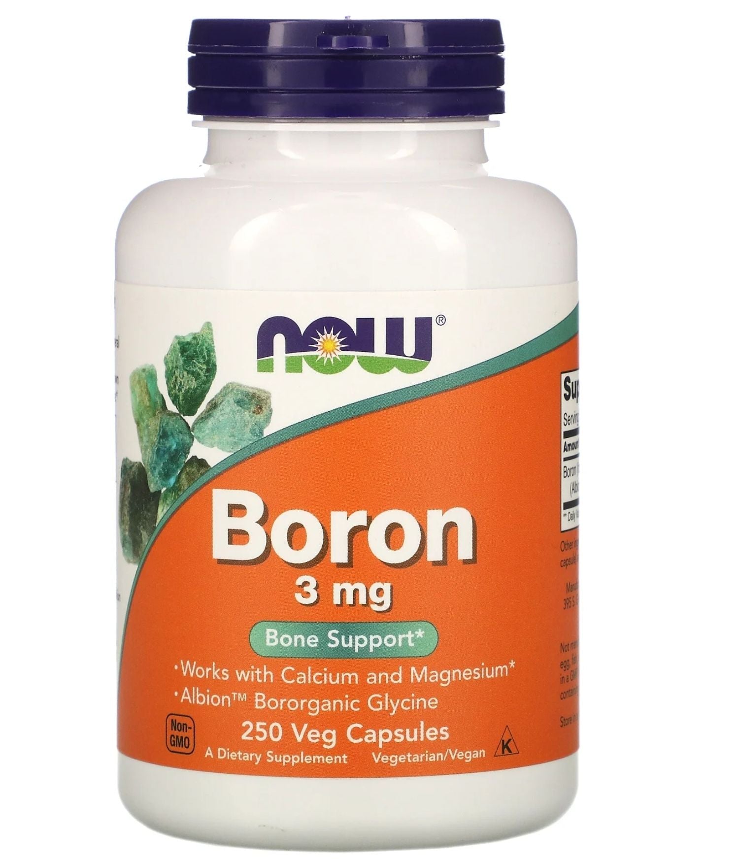 Boron is a biologically active trace mineral that affects calcium, magnesium and phosphorus metabolism. Boron is known to support bone strength and structure.