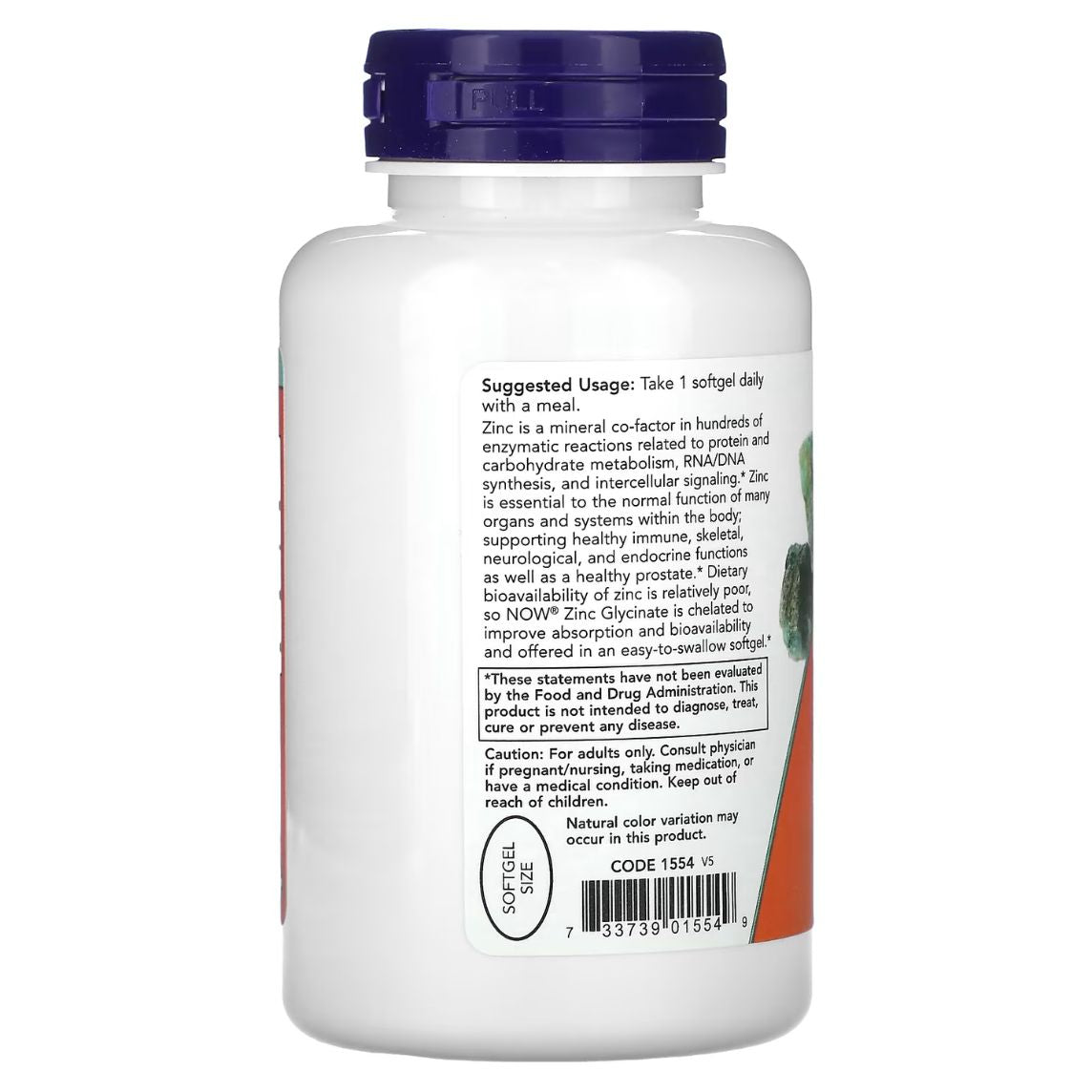 Zinc is a mineral co-factor in hundreds of enzymatic reactions related to protein and carbohydrate metabolism, RNA/DNA synthesis, and intercellular signaling. Zinc is essential to the normal function of many organs and systems within the body; supporting healthy immune, skeletal, neurological, and endocrine functions as well as a healthy prostate. Dietary bioavailability of zinc is relatively poor, so NOW® Zinc Glycinate is chelated to improve absorption and bioavailability and offered in an easy-to-swallow softgel.
