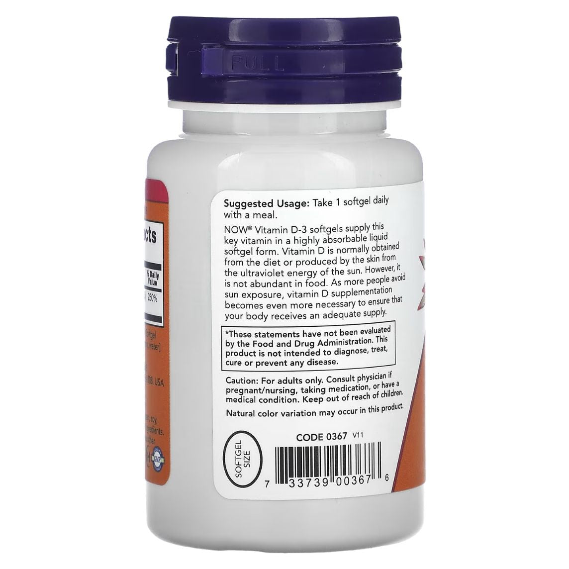 NOW Vitamin D-3 softgels supply this key vitamin in a highly-absorbable liquid softgel form. Vitamin D is normally obtained from the diet or produced by the skin from the ultraviolet energy of the sun. However, it is not abundant in food. As more people avoid sun exposure, Vitamin D supplementation becomes even more necessary to ensure that your body receives an adequate supply.