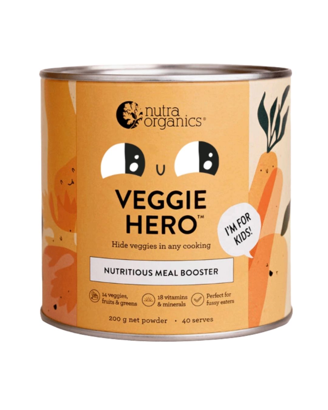 Packed with 14 organic vegetables, fruits and greens, Veggie Hero delivers 18 bioavailable vitamins and mineralsincluding vitamins A, C, D, E, B-complex, zinc, folate, and iodine — all from real, organic wholefood sources.