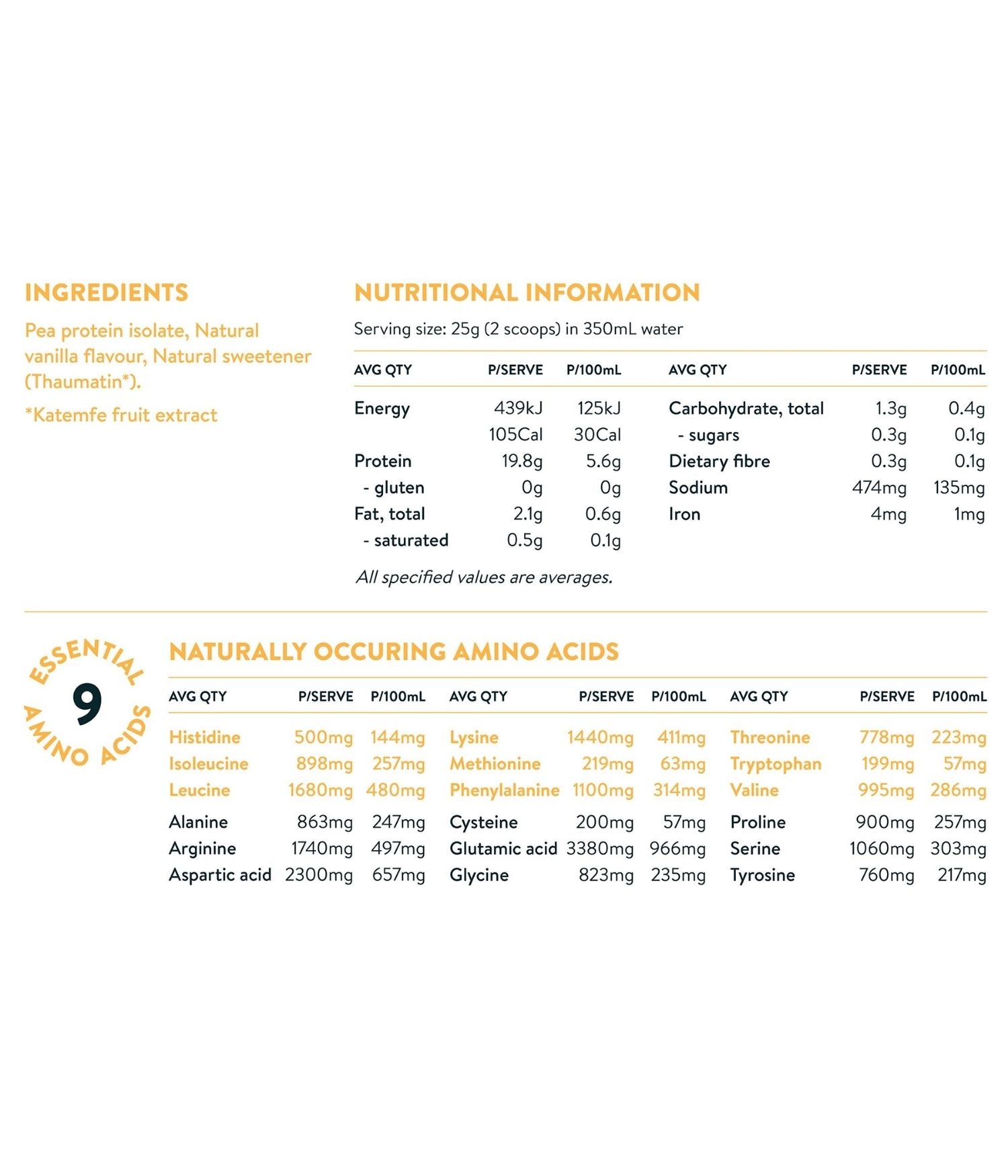 Clean Lean Protein provides the building blocks for vitality, repair, recovery and muscle growth. Our unique pea protein formula is 100% plant-based, low in allergens and extremely low in carbohydrates. Made with minimal processing and ingredients, it comes complete with all nine essential amino acids, is a natural source of iron, tasty and easy to digest.