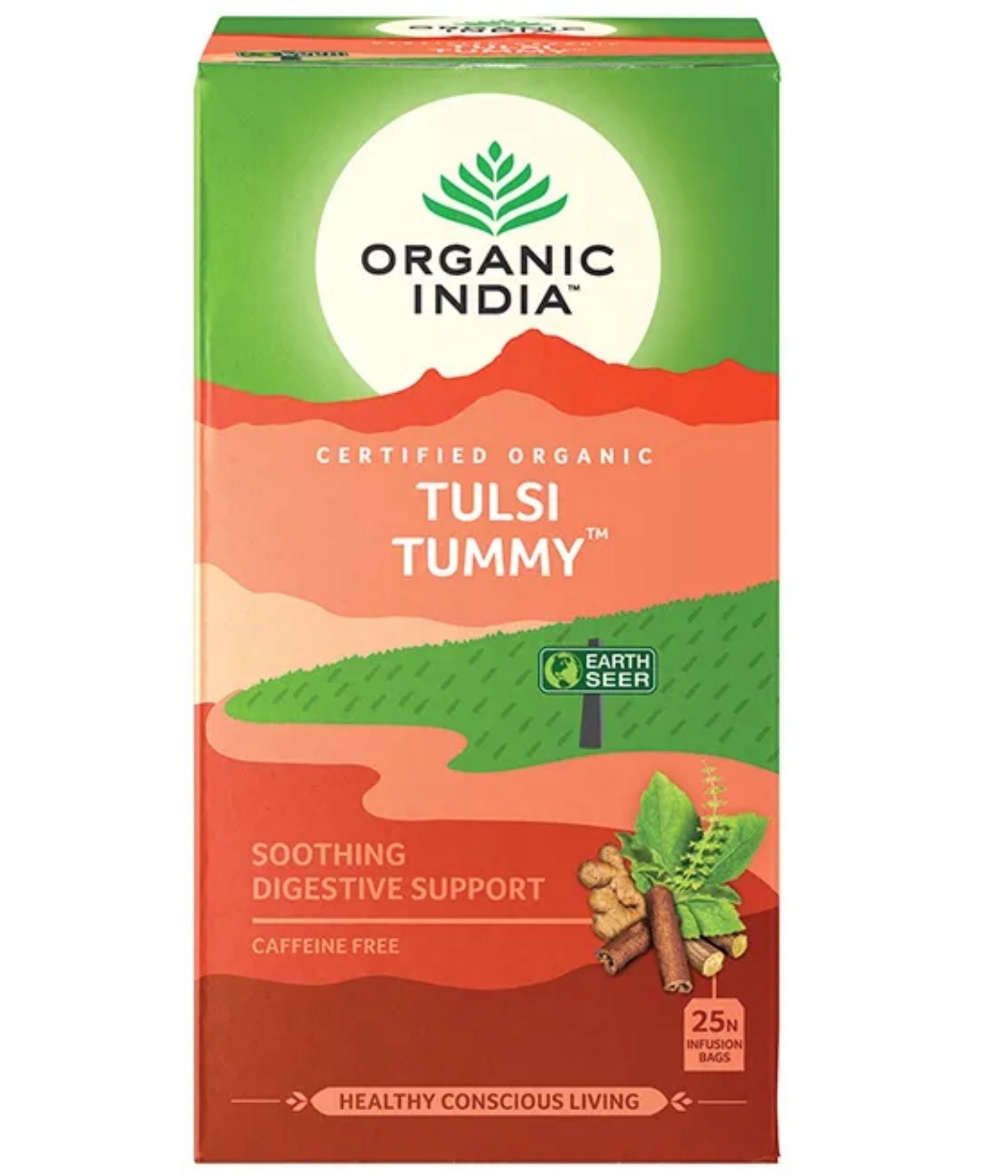Tulsi Tummy - Three sacred varieties of Tulsi: Vana, Krishna and Rama, which offer potent restorative powers, are blended with Ginger, Cinnamon, Licorice and Peppermint to settle the tummy. This delicious and effective blend of soothing, healing herbs calms the stomach and supports healthy digestion. Enjoy drinking before or after a meal.