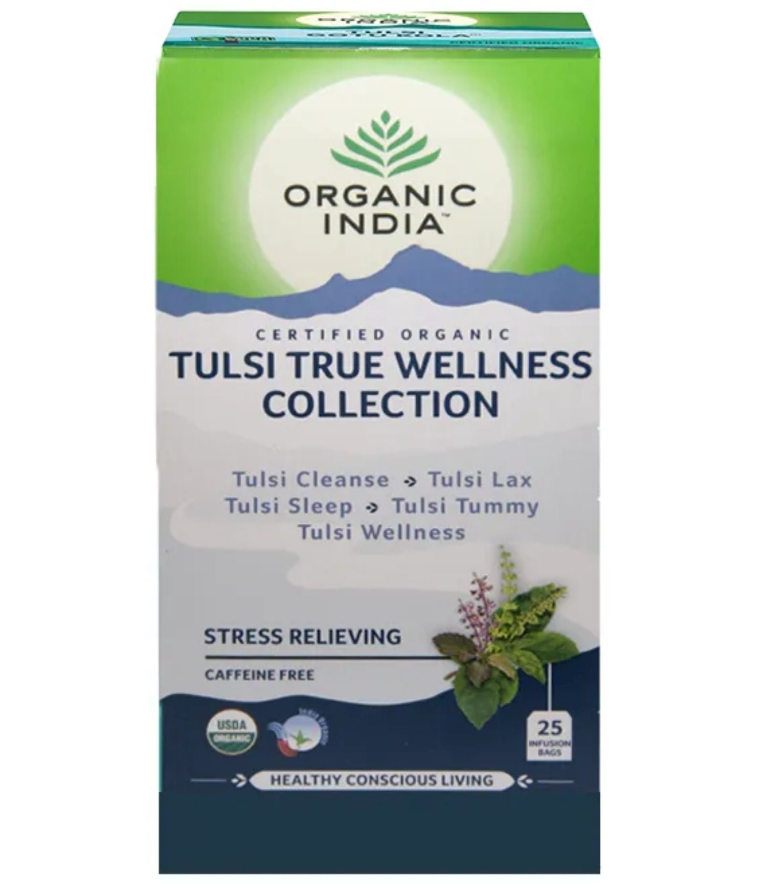 True wellness collection includes 5 of the best selling herbal functional Tulsi teas from the wellness range in one box. Including Tulsi Cleanse ( daily liver and Kidney cleanse) Tulsi Lax ( gentle effective herbal laxative), Tulsi Sleep ( promotes calm, restful sleep), Tulsi Tummy (Soothing Digestive support) and Tulsi Wellness ( Vitalising stress relief).