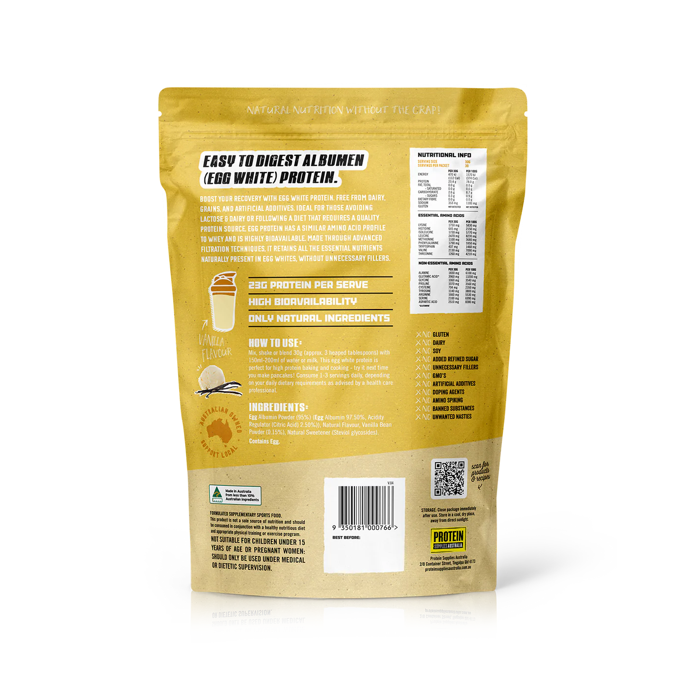 Looking for a high-protein alternative to whey? Our Egg White Protein – Vanilla is a clean, natural, and effective protein source — perfect for those who are lactose-intolerant, following a paleo lifestyle, or seeking a dairy-free option. Each serve delivers 22g of complete protein to support muscle growth, recovery, and overall wellness.