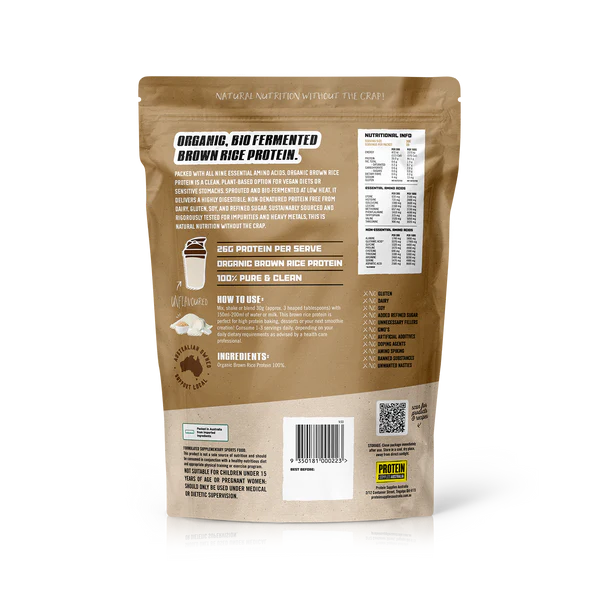 Organic Fermented Sprouted Wholegrain Brown Rice Protein Isolate is a premium plant-based protein designed for those who want clean, efficient and highly digestible nutrition. Delivering over 27g of complete protein per serve, it provides all 9 essential amino acids to support muscle recovery, lean muscle development and everyday wellbeing. Made from 100 percent organic, GMO-free wholegrain brown rice, this protein powder is naturally hypoallergenic, gentle on digestion and ideal for vegans, athletes and anyone seeking a pure plant-based alternative. Its naturally neutral, unflavoured profile makes it easy to blend into smoothies, shakes, soups, or baked recipes without altering taste or texture. Highly versatile and incredibly clean, it’s the perfect protein for building strength, supporting recovery, and elevating your daily nutrition.