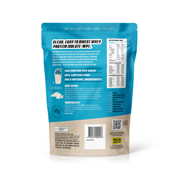Whey Protein Isolate (WPI) Unflavoured is crafted for those who demand a high-performance protein source that keeps up with their training. Designed to support lean muscle development, enhance recovery, and elevate daily nutrition, this ultra-pure formula delivers results without unnecessary additives. Packed in Australia and made from 99.5 percent pure Whey Protein Isolate, each serve provides 26g of fast-digesting, low-lactose protein that’s gentle on the gut and perfect for athletes and active individuals. With no flavours, sweeteners, or colours, this unflavoured WPI gives you complete control over taste and texture. Add it to smoothies, shakes, oats, yoghurt, or baking for a clean, versatile protein boost that fits seamlessly into any routine. Pure, simple and highly effective, it’s the ideal choice for anyone wanting premium-quality protein without compromise.