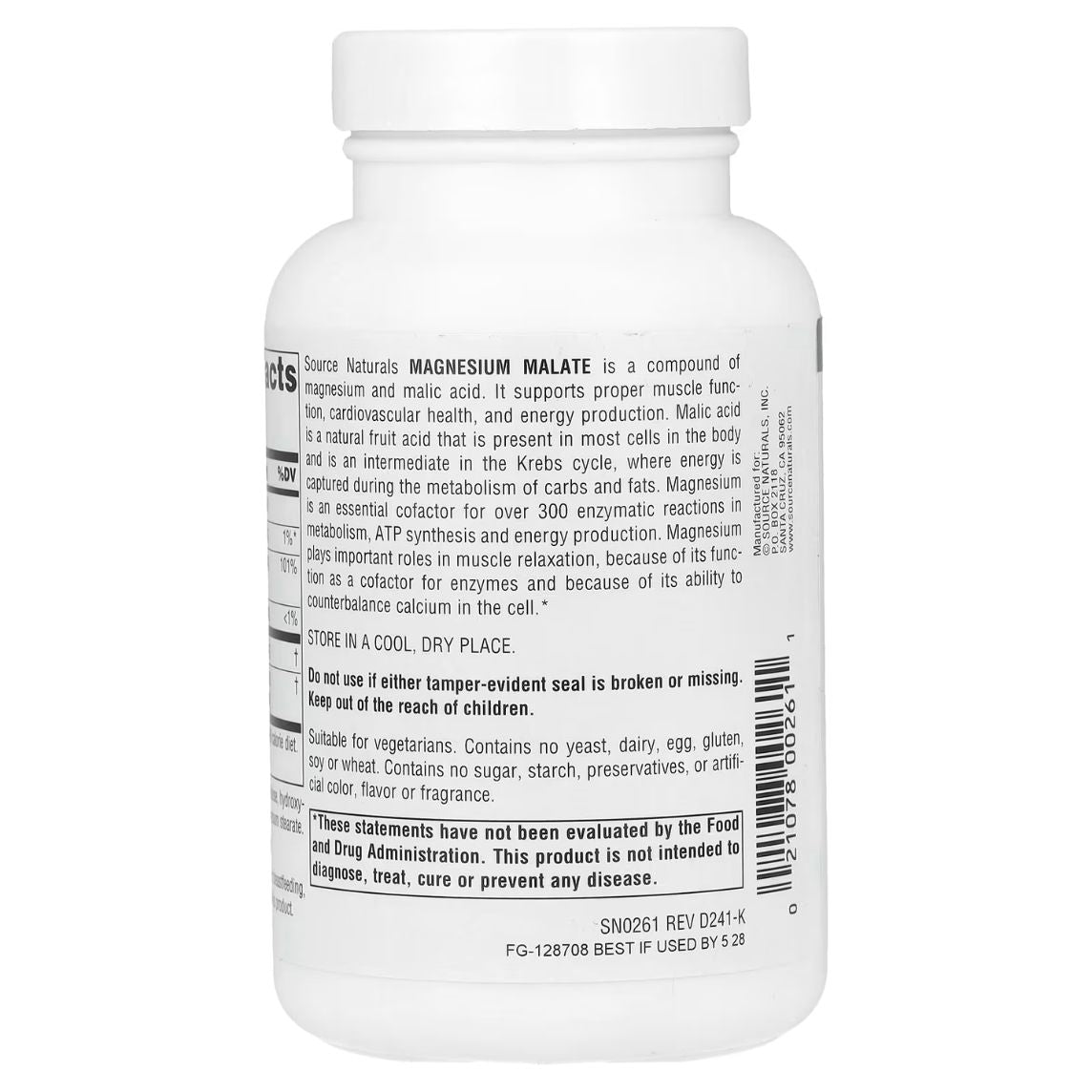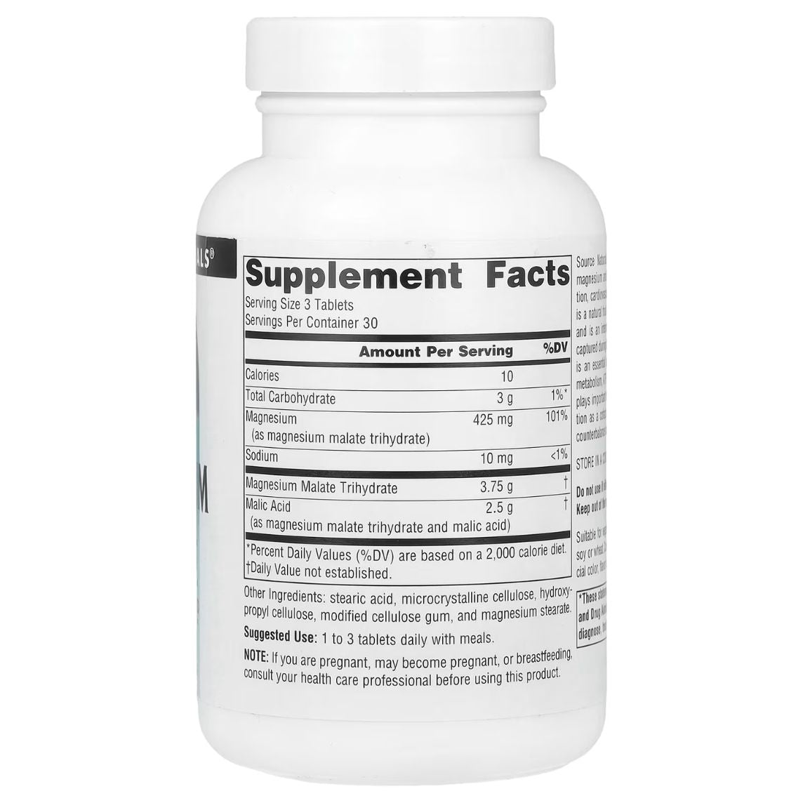 Source Naturals Magnesium Malate is a compound of magnesium and malic acid. Malic acid is a natural fruit acid that is present in most cells in the body and is an important component of numerous enzymes key to ATP synthesis and energy production. Magnesium is an essential mineral in over 300 enzymatic reactions in metabolism. Preliminary studies suggest that magnesium malate supports the body's own detoxification of aluminum in the brain.