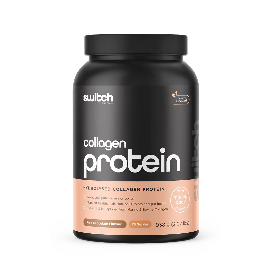 Revitalise your body from the inside out with Collagen Switch – a powerful blend of grass-fed bovine and ethically sourced marine collagen, delivering a full spectrum of Type I, II & III collagen peptides.