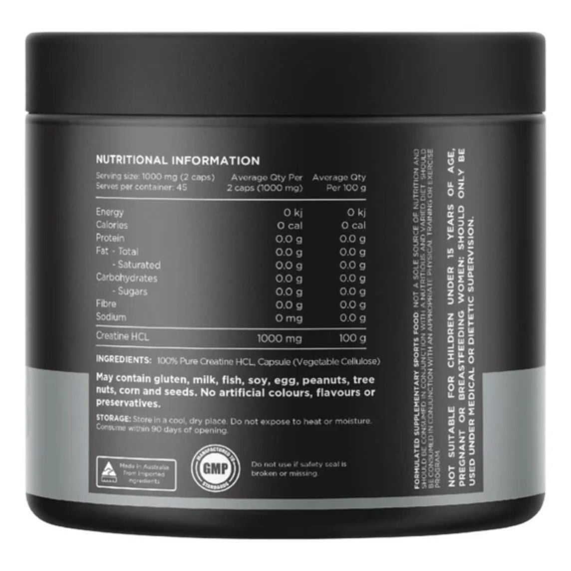 INGREDIENTS: 100% Pure Creatine HCL, Capsule (Vegetable Cellulose)