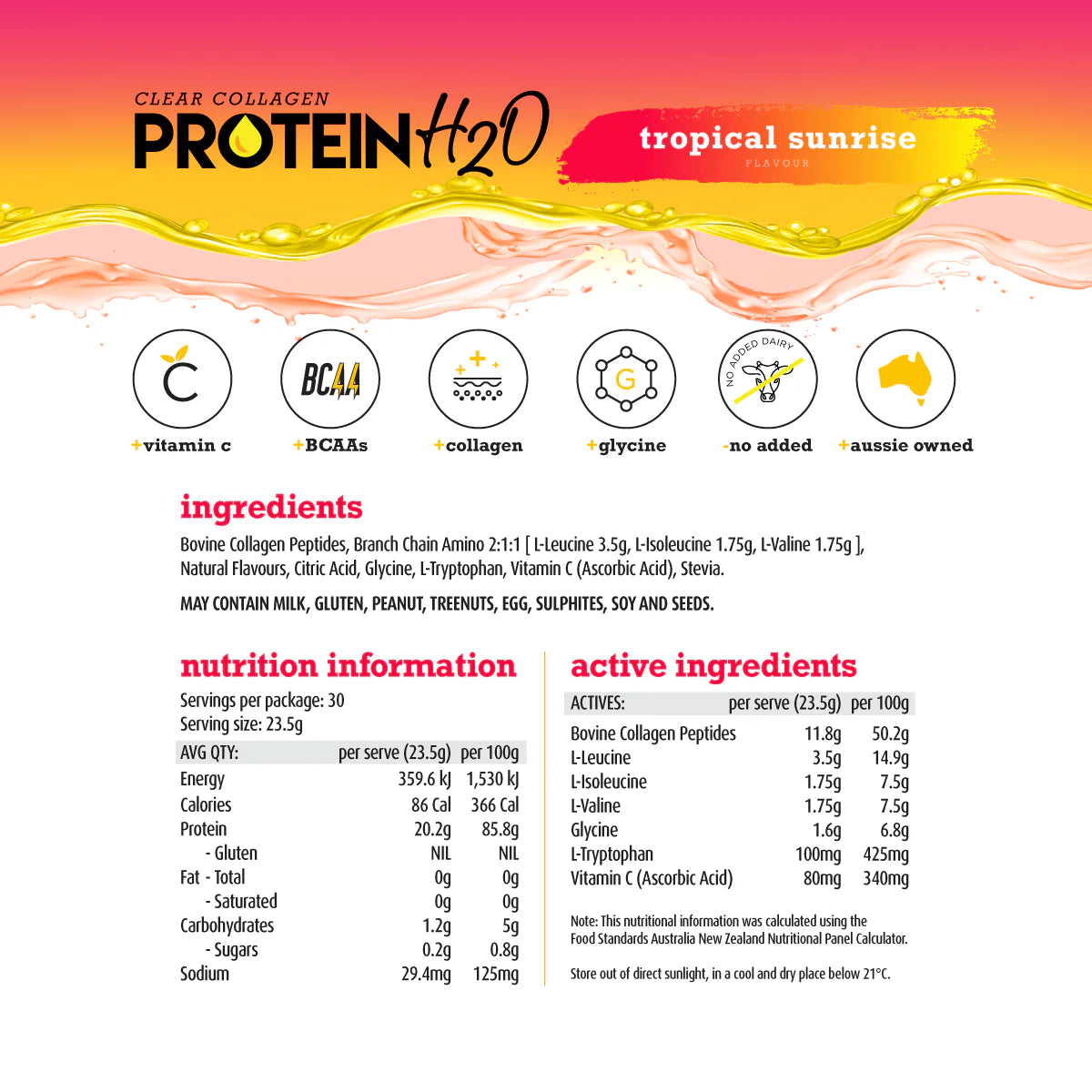 This clear protein water is made with high-quality hydrolysed collagen and packed with benefits to support muscle recovery, skin health, gut function, and overall wellbeing. Each serve delivers over 20g of protein, plus it's boosted with BCAAs, Vitamin C, L-Tryptophan, and Glycine for maximum impact.