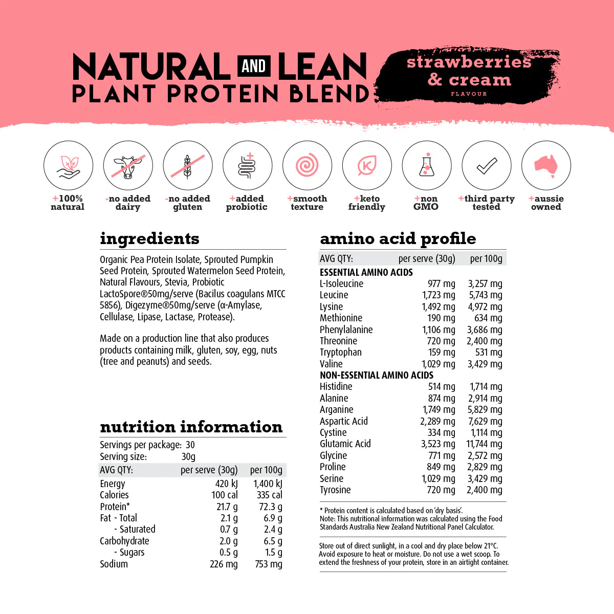 Meet your new favourite plant-based protein: Natural + Lean Plant Protein – a smooth, easy-to-digest blend crafted from three powerful sources: organic pea, watermelon seed, and pumpkin seed protein.