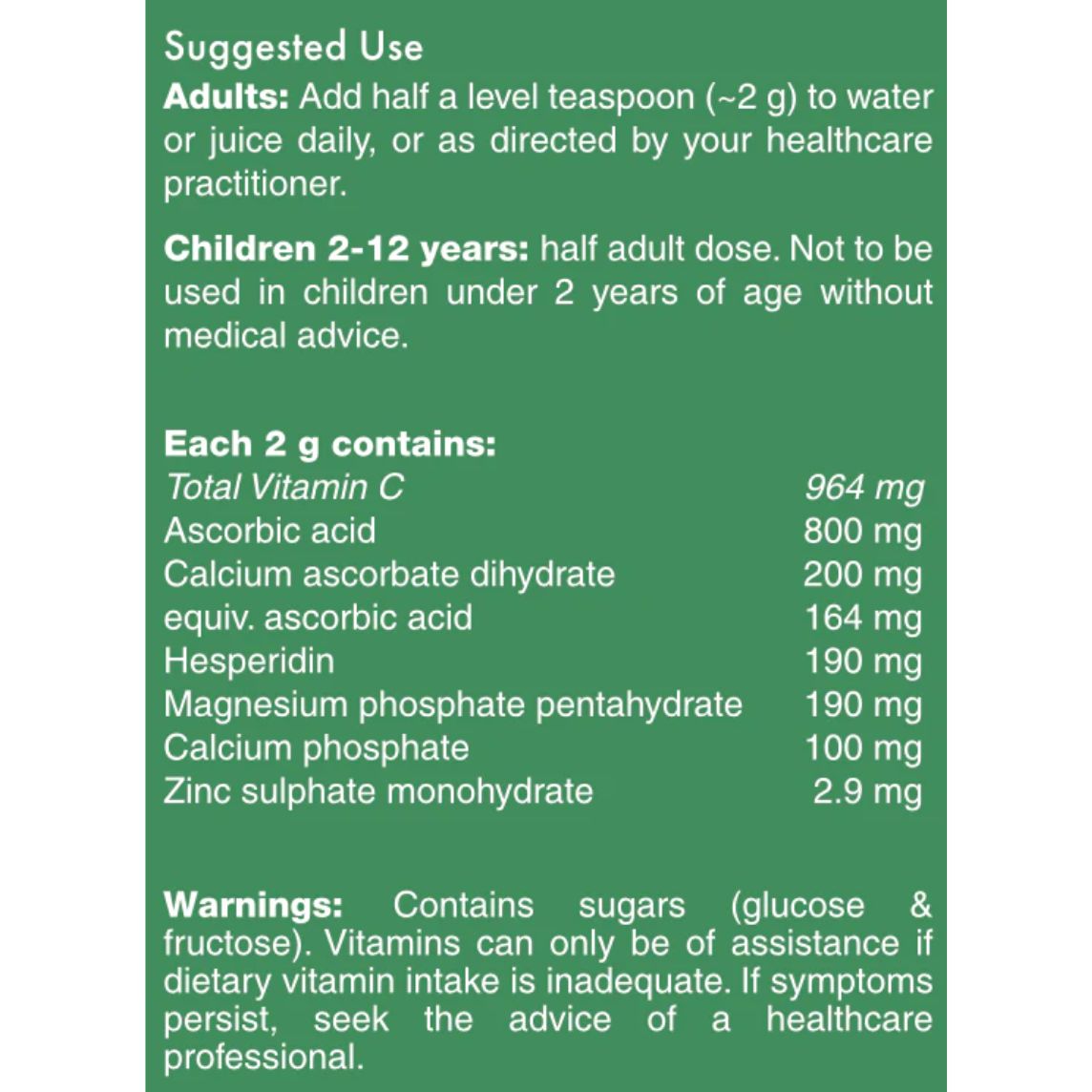 Adults: Add half a level teaspoon of Wonder Foods Tangy Vitamin C (~2 g) to water or juice daily, or as directed by your healthcare practitioner.